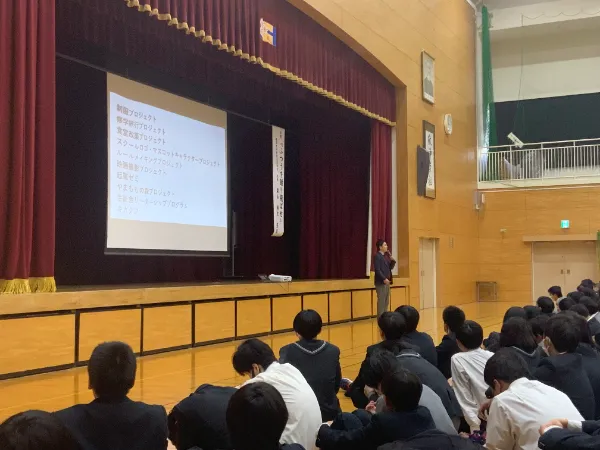 「ふつうを蹴り飛ばせ」という演題のもと、生徒に対して、柴山校長の学生時代の経験や最年少で校長に就任した経験、実際に指導してきた生徒の様子を交えながら、