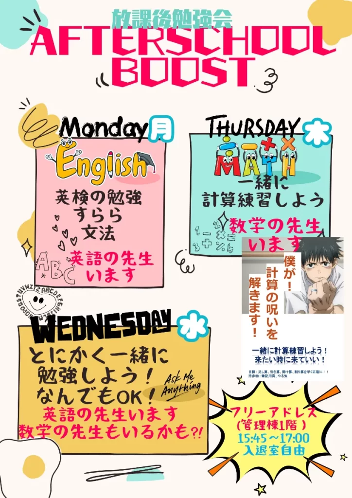 放課後に勉強したい生徒達が集まる「AFTERSCHOOL  BOOST」が始まりました!