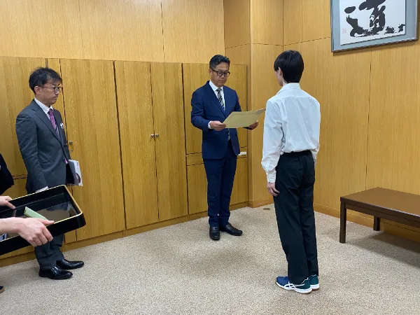 先日、下校途中の道端で倒れていた高齢男性を介抱し、周囲にいた人に声をかけ救急車の手配をお願いするなど、適切な対応をした3年2組の畑板好誠(城山中学校出身)さん。