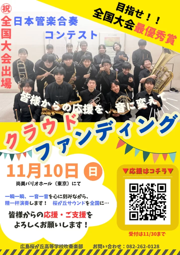 本校吹奏楽部の第30回日本管楽合奏コンテスト全国大会出場に伴い立ち上げさせていただいたクラウドファンディングですが、今月末(11/30)をもちまして受付終了となります。