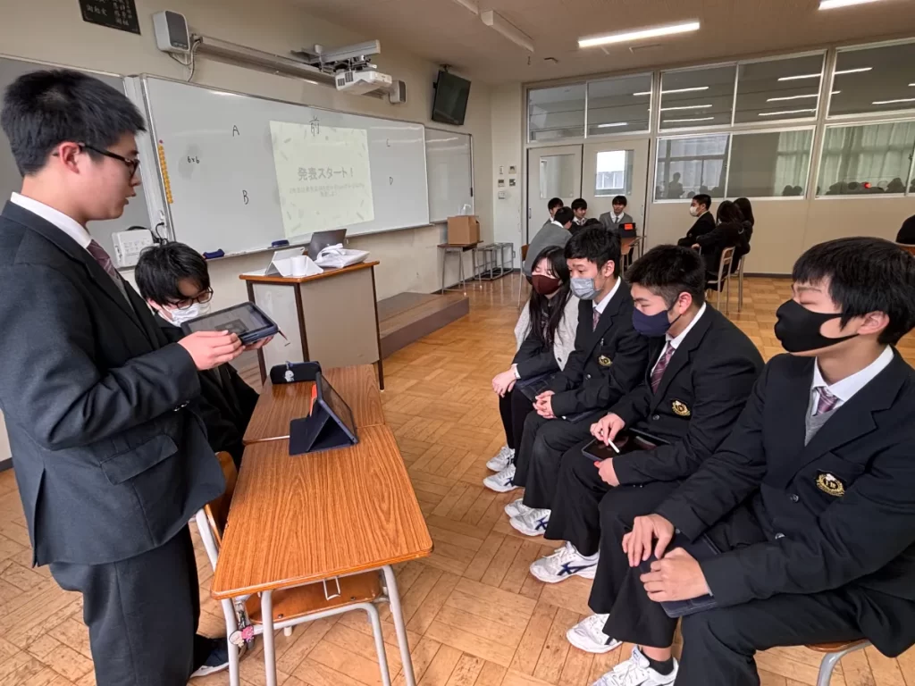 今年度、2年生が総合的な探究の時間の授業をとおして学んできたことや企業連携の経験を、1年生に向けて発表・共有し、次年度の活動に生かそうというものです。