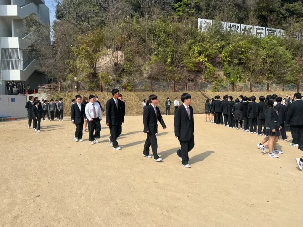 訓練では、火災発生の放送を合図に、生徒たちは教職員の指示に従いながら迅速かつ落ち着いて校庭へと避難。緊張感をもって真剣に取り組む姿が印象的でした。