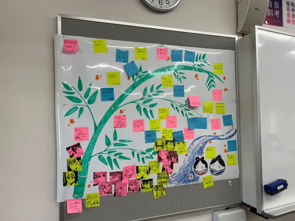 教室に竹の絵を描き、色とりどりの付箋で願い事を貼り付けていき楽しみました♪願いを込めた付箋には、生徒一人ひとりの大切な想いが込められています。みんなの願いが叶いますように…🎋✨