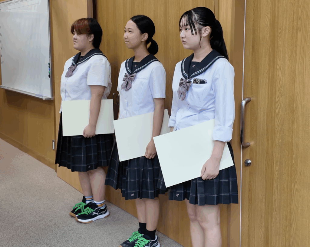 参加したのは、1年1組の甲斐さん、1年5組の千同さん、吉村さんの3名です。