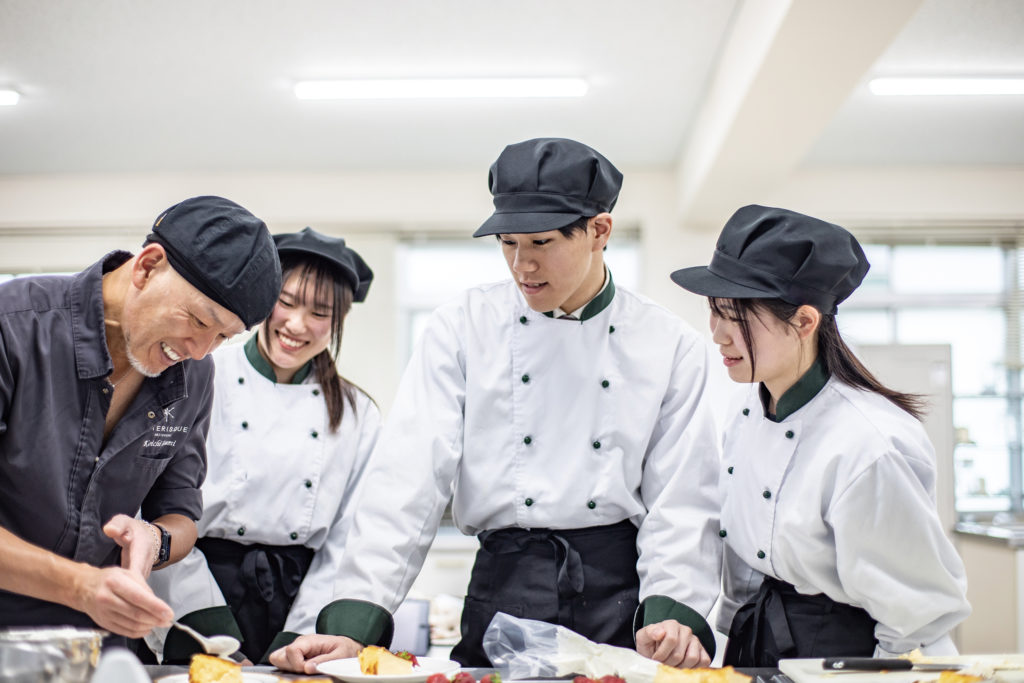 実践的なスキルを習得できる豊富な調理実習を用意。プロの料理人やパティシエの指導を直接受け、現場で求められる技術や知識を学びます。