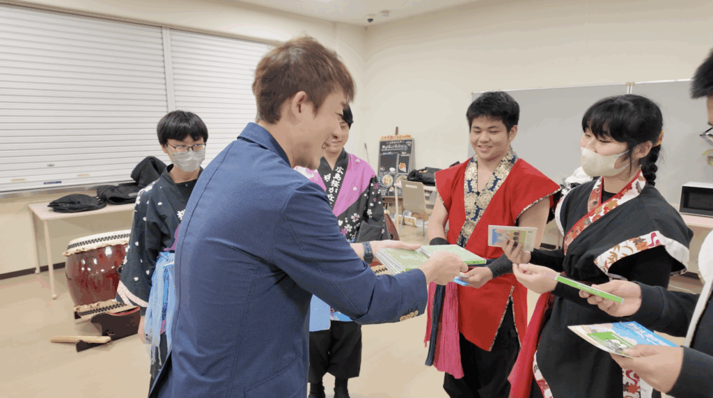 今回の訪問は、当時1年生として初めてグリーンリボンフェスに参加した部員たちが、12月13日(土)開催の「第23回広島県高等学校郷土芸能大会」で引退を迎えるにあたり、グリーンリボンの関係者として激励にお越しくださったものです。